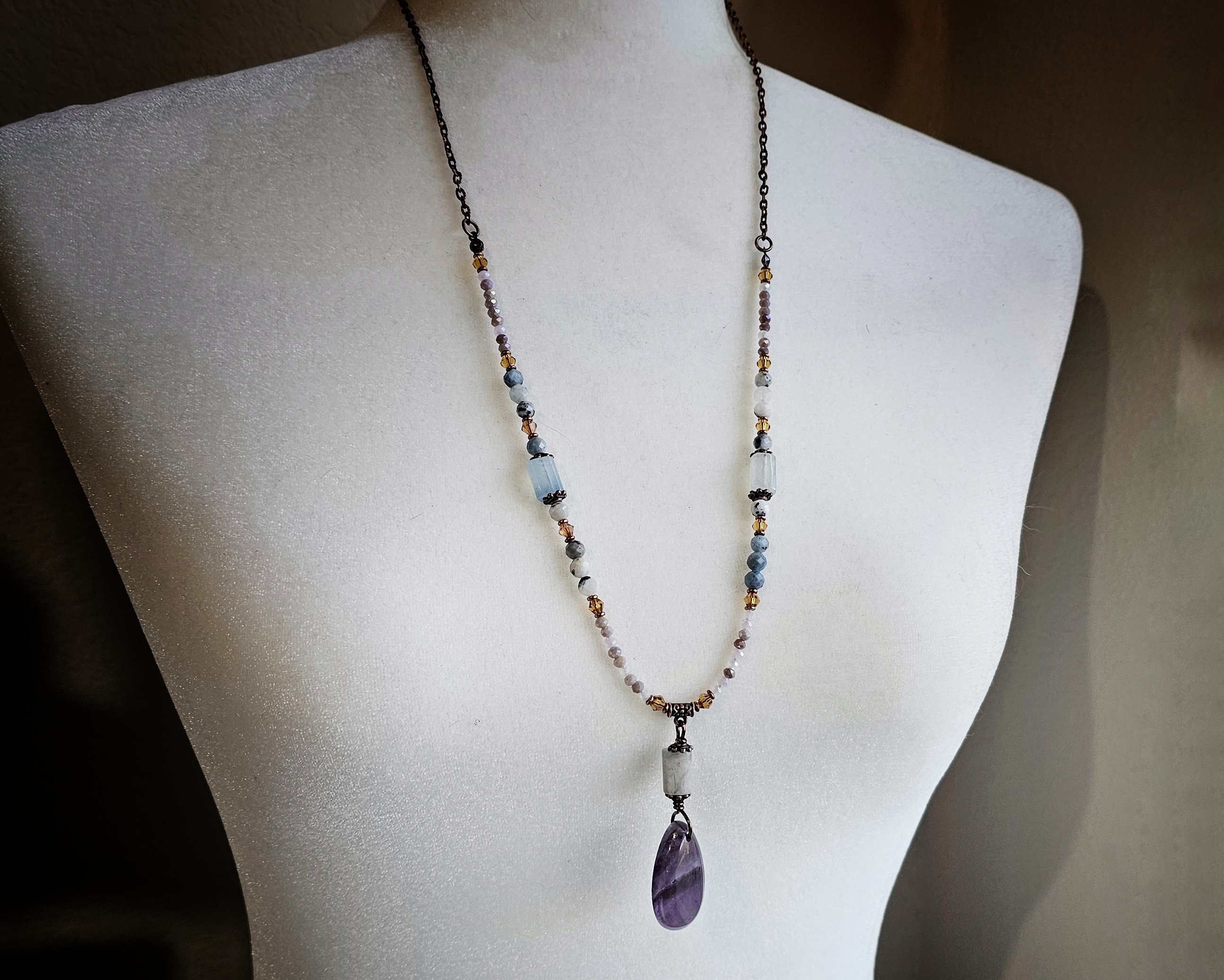 Materials: Amethyst, aquamarine, faceted aquamarine beads, crystals, copper accents, copper chain