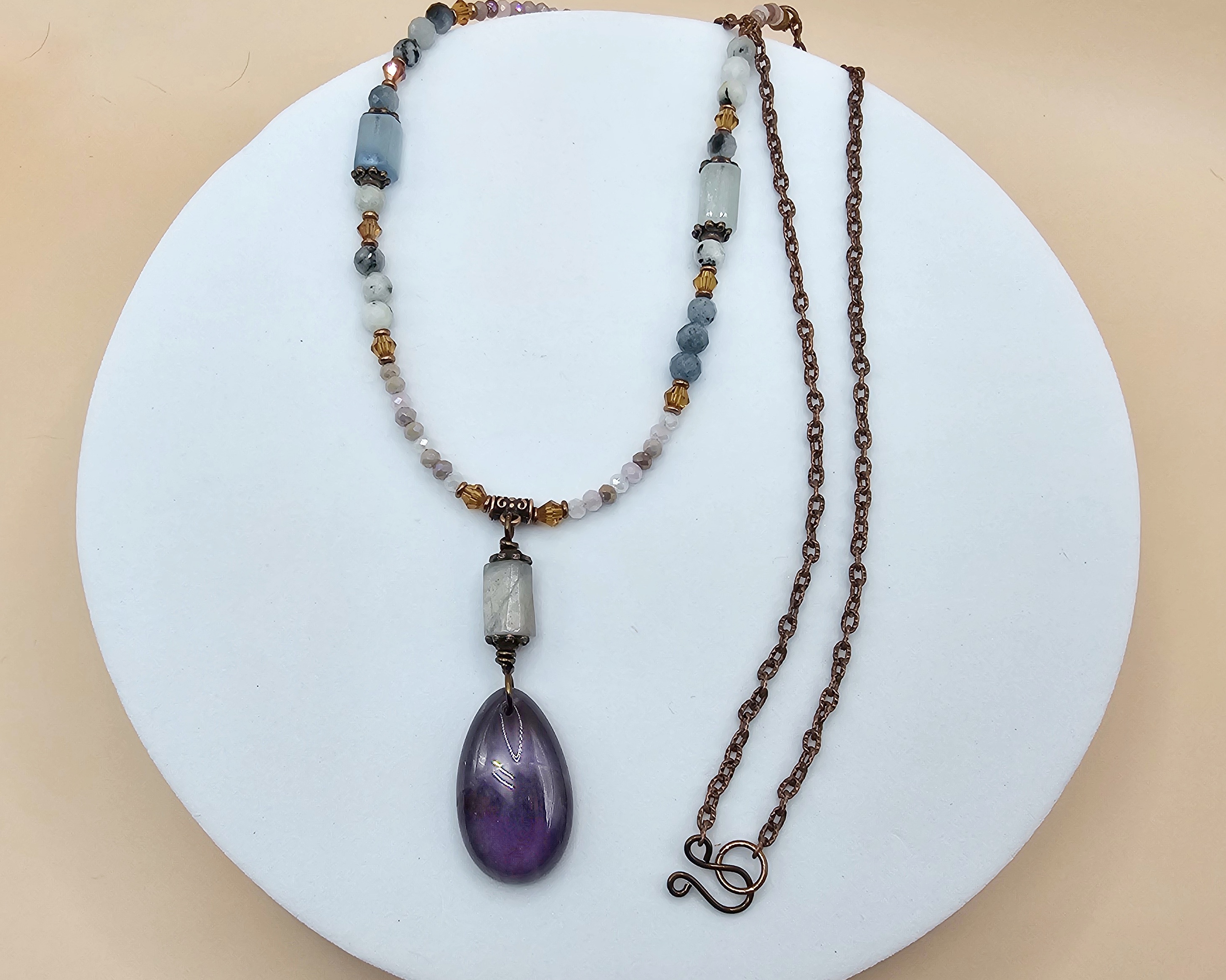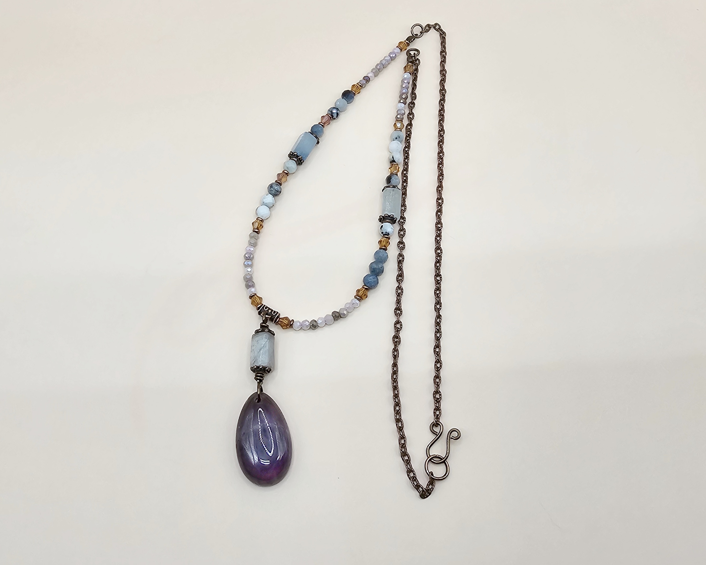 The focal of this necklace is the 2-inch pendant featuring a polished amethyst teardrop paired with an aquamarine barrel bead. Copper accents bring warm and earthy tones to the piece. The necklace strand blends faceted aquamarine beads, delicate crystals, and copper accents with a rustic copper chain, creating a soft, balanced palette of purples, blues, and metal.