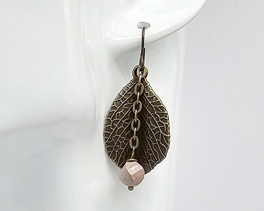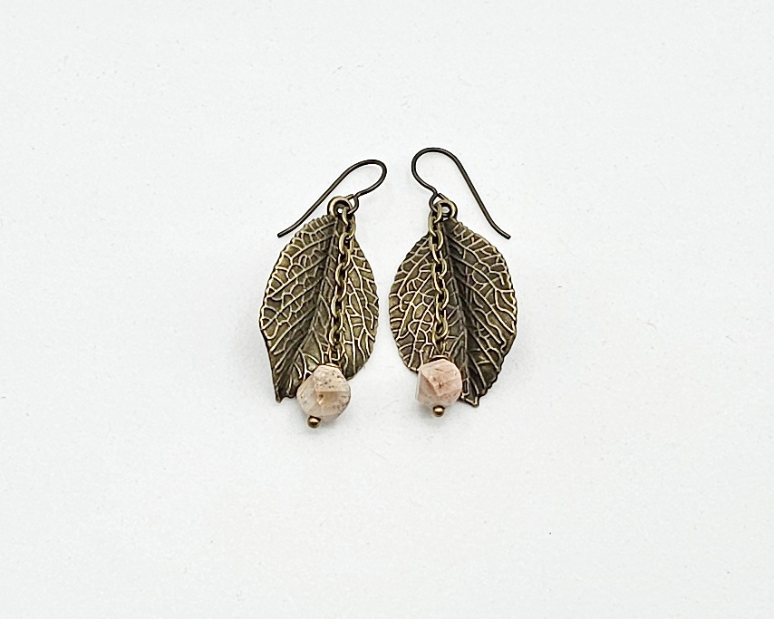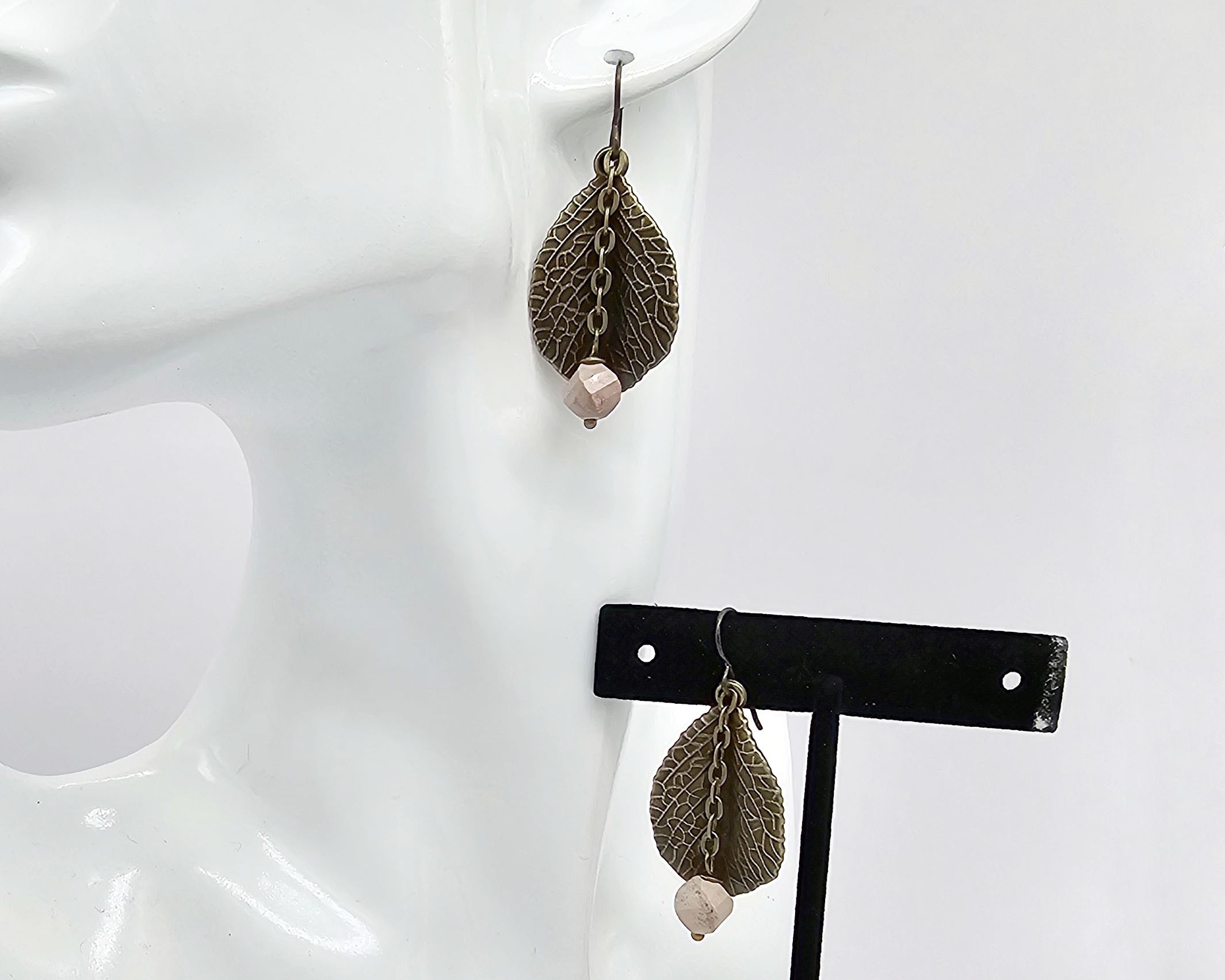 These Autumn Leaf Mookaite Beads Earrings bring a breath of brisk air to your wardrobe. Measuring approximately 2 inches in length, each earring features a brass leaf charm paired with a vibrant Mookaite bead dangle. Mookaite is known for it's rich mixture of warm, earthy tones, which complement the brass elements beautifully. This design offers a lightweight yet striking accessory for any occasion. The hypoallergenic niobium earring wires ensure comfortable wear, making them suitable for sensitive ears.