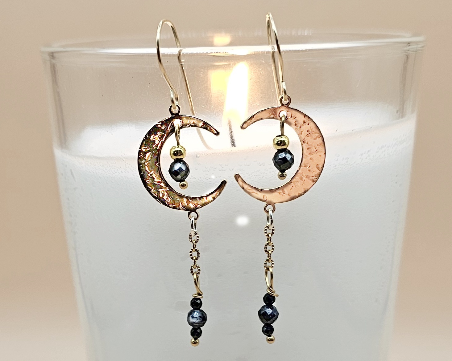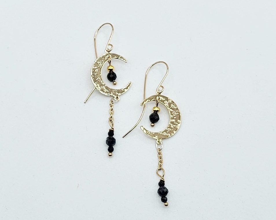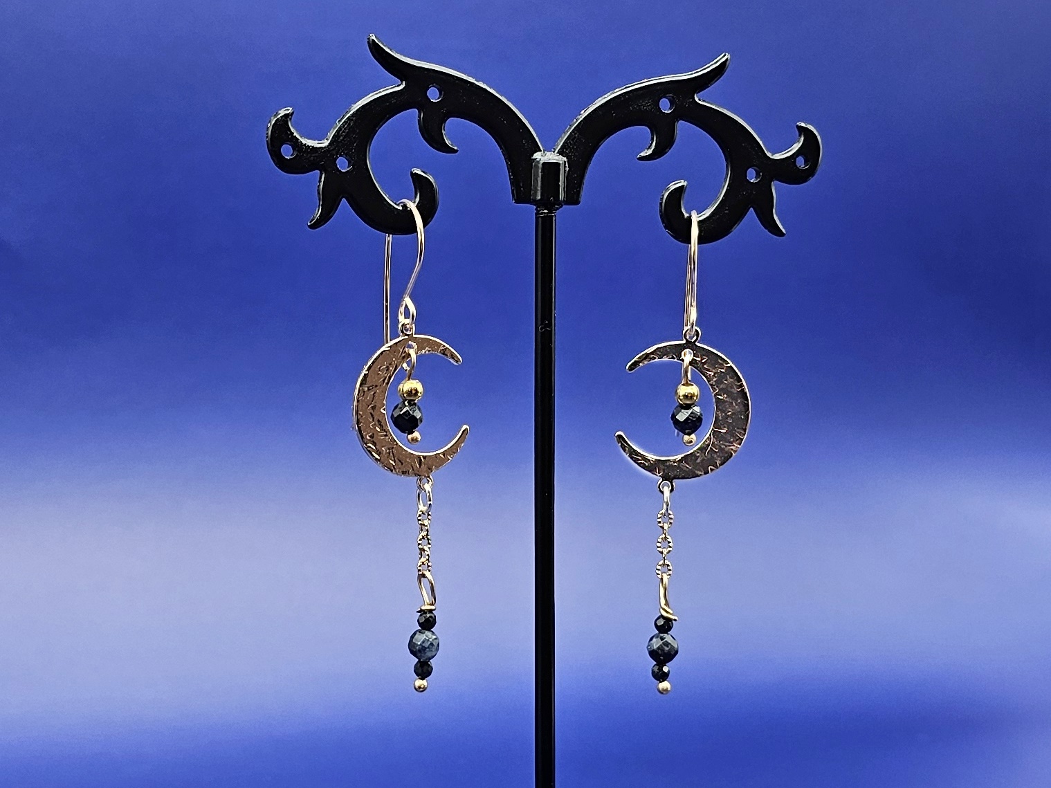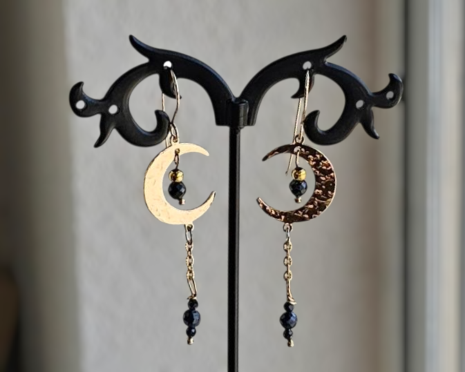 Perfect for dreamers and stargazers, these handcrafted earrings combine elegance with celestial charm. Measuring approximately 2.5 inches long, these earrings feature a hammered gold-plated brass crescent moon, delicate tiny diamond-cut AA-grade sapphire beads, and luxurious 14k gold-filled ear wires for lasting quality and comfort.