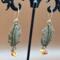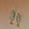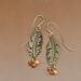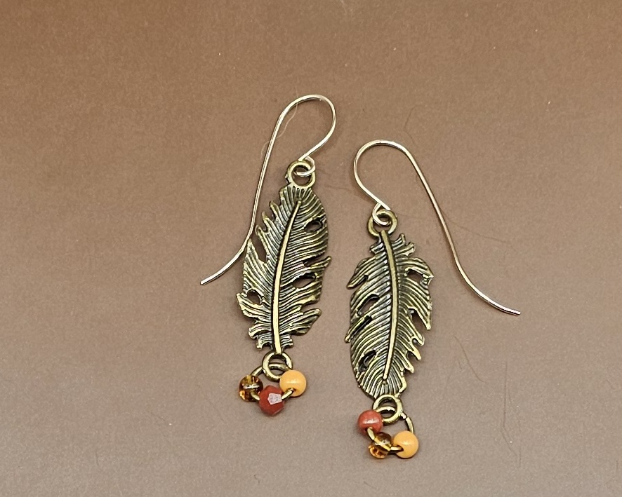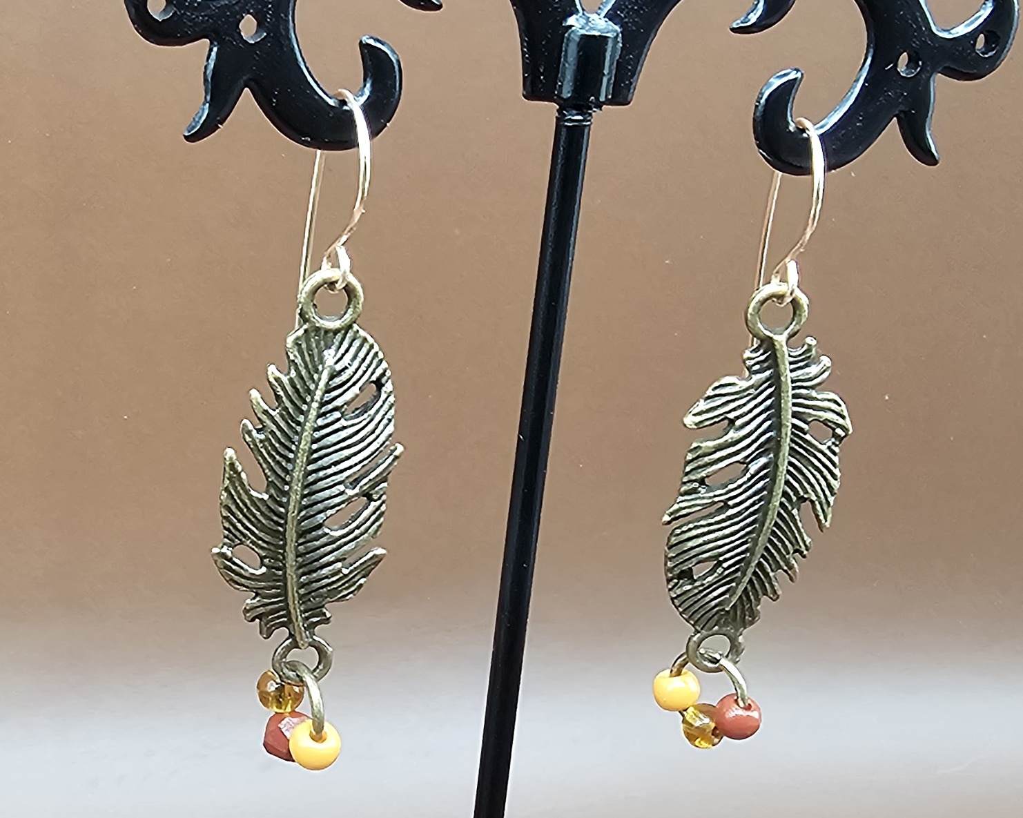 Components: Brass leaf dangles, glass seed beads, handmade 14K gold earring wires