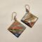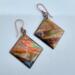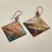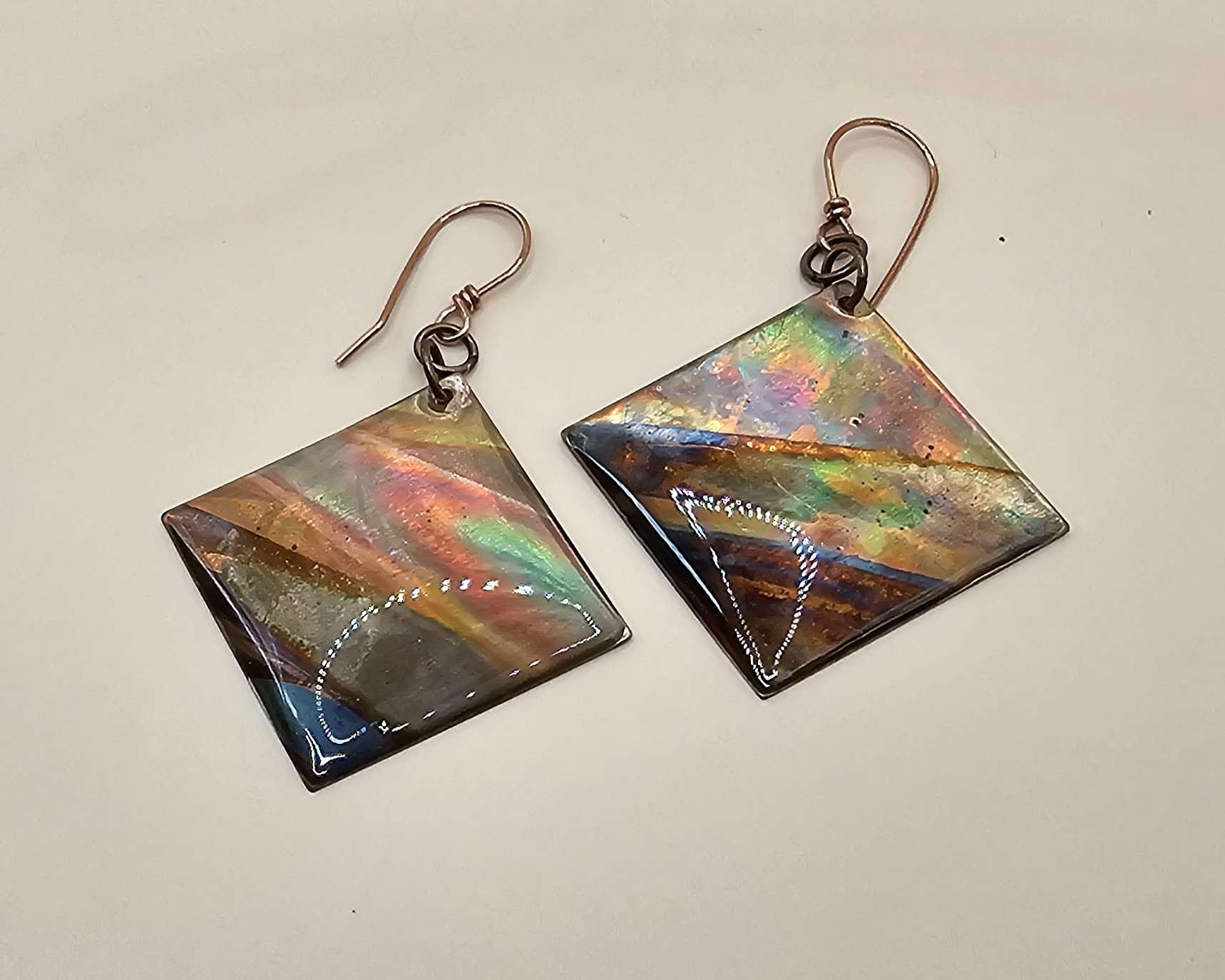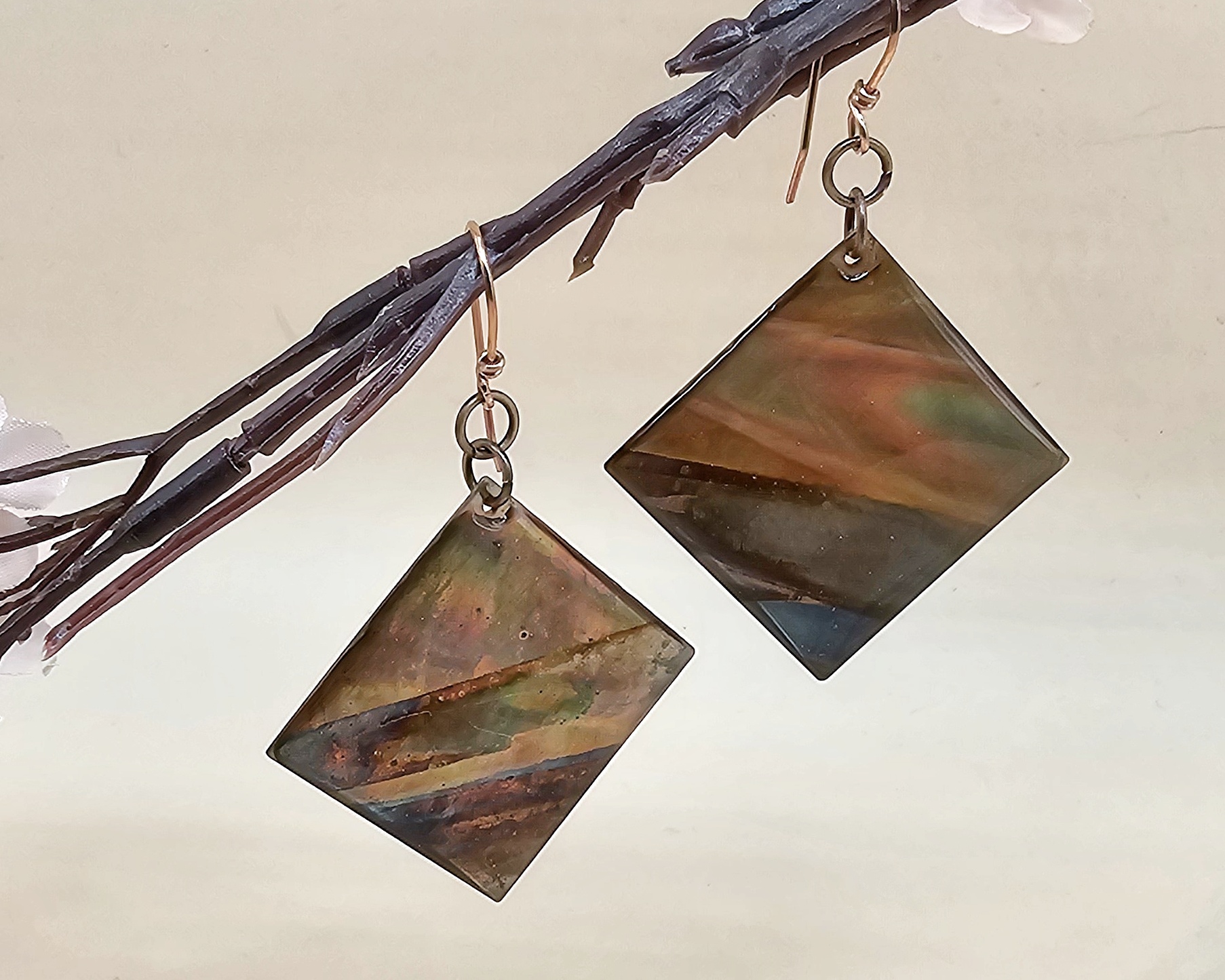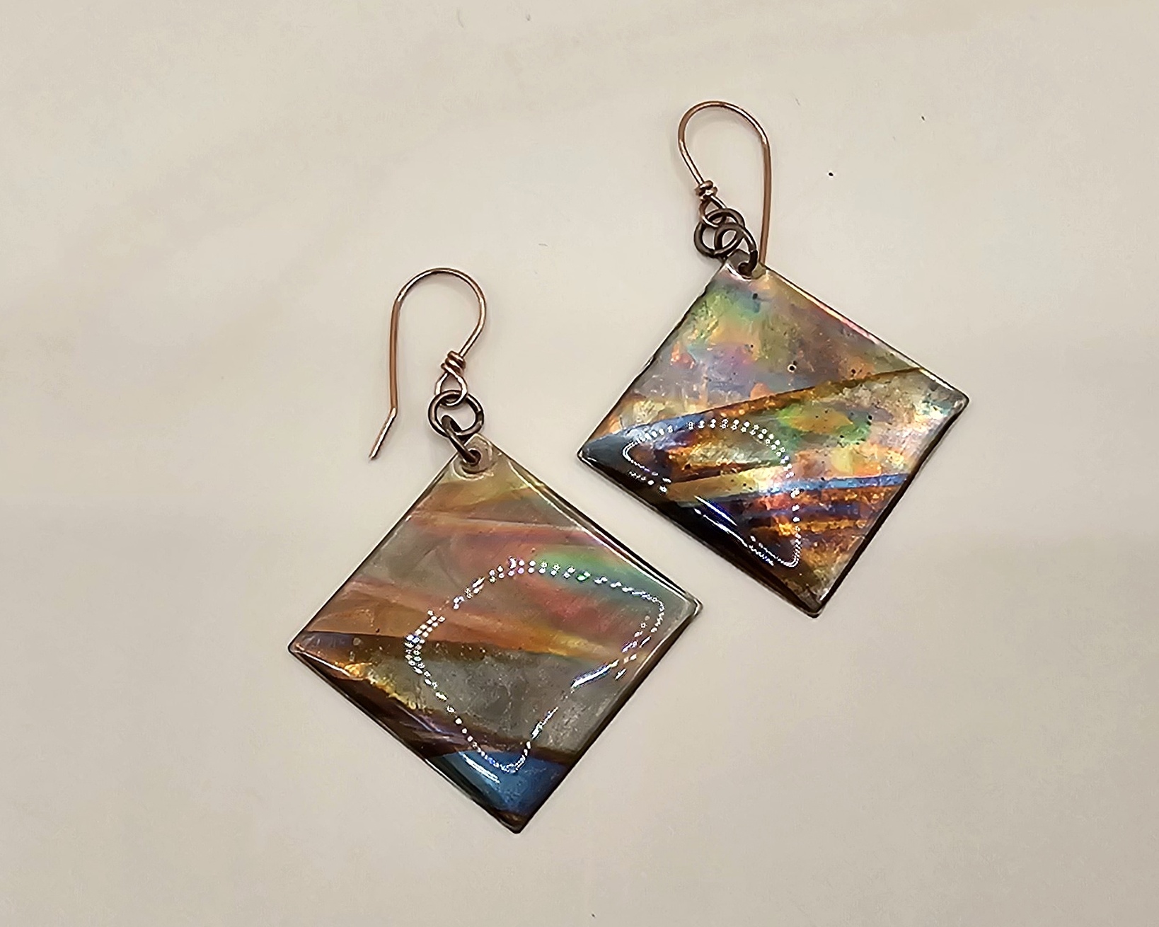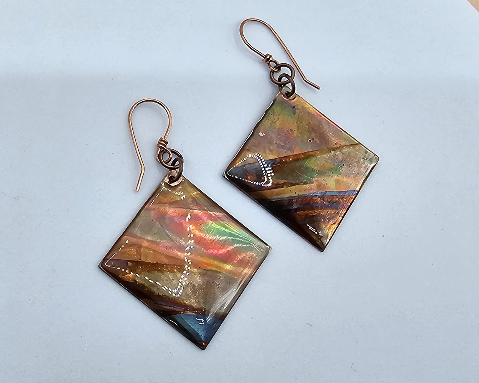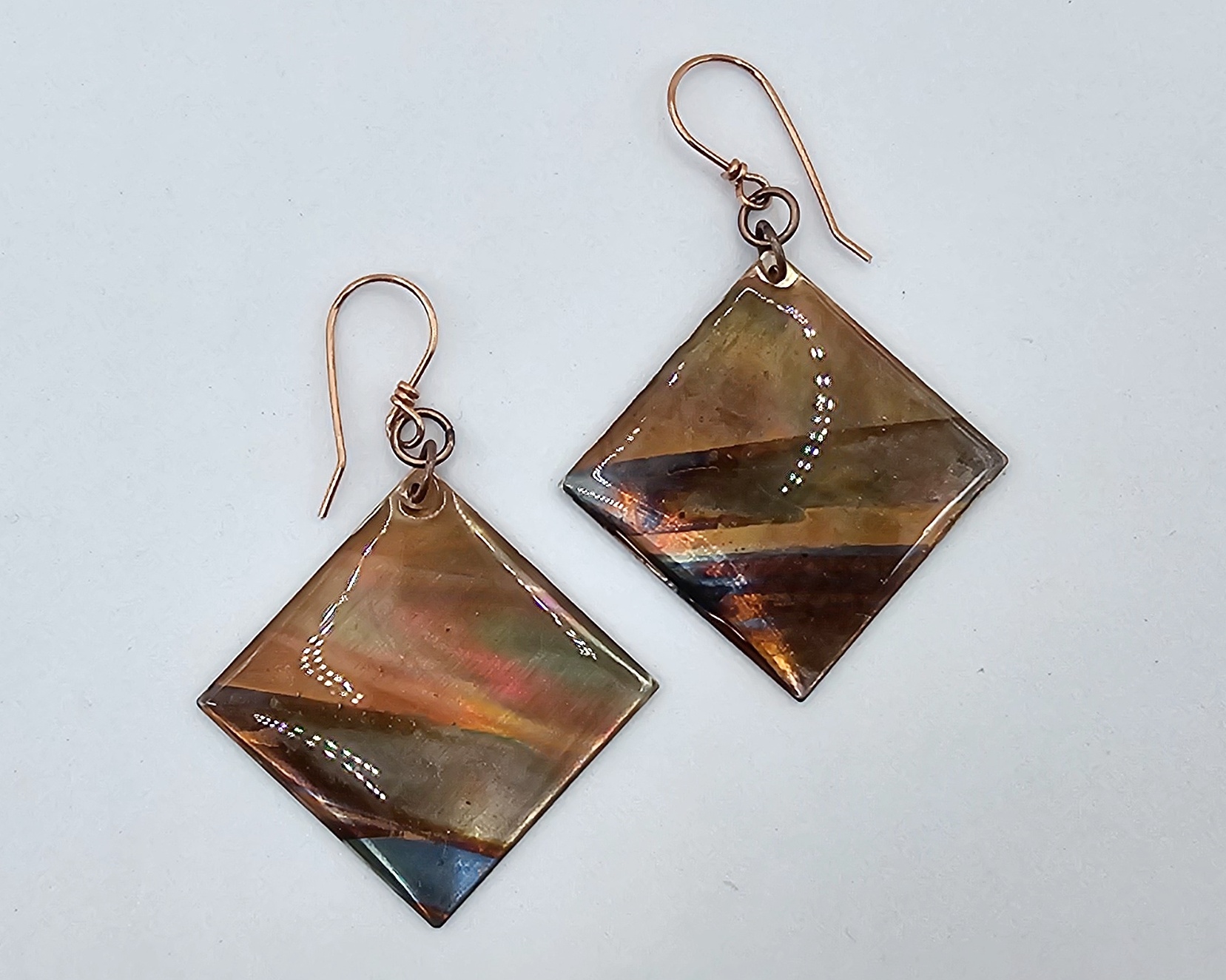 I began with 24 gauge square copper blanks that I torch fired to bring out the underlying colors. Then, I sealed using UV resin and hung on 21 gauge handcrafted earring wires.