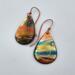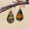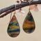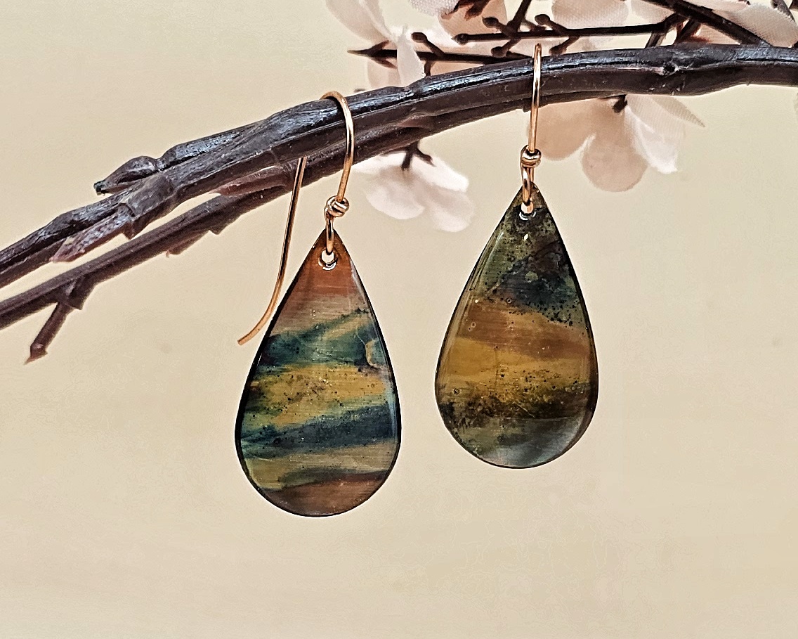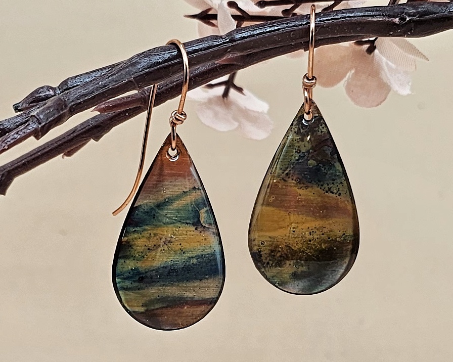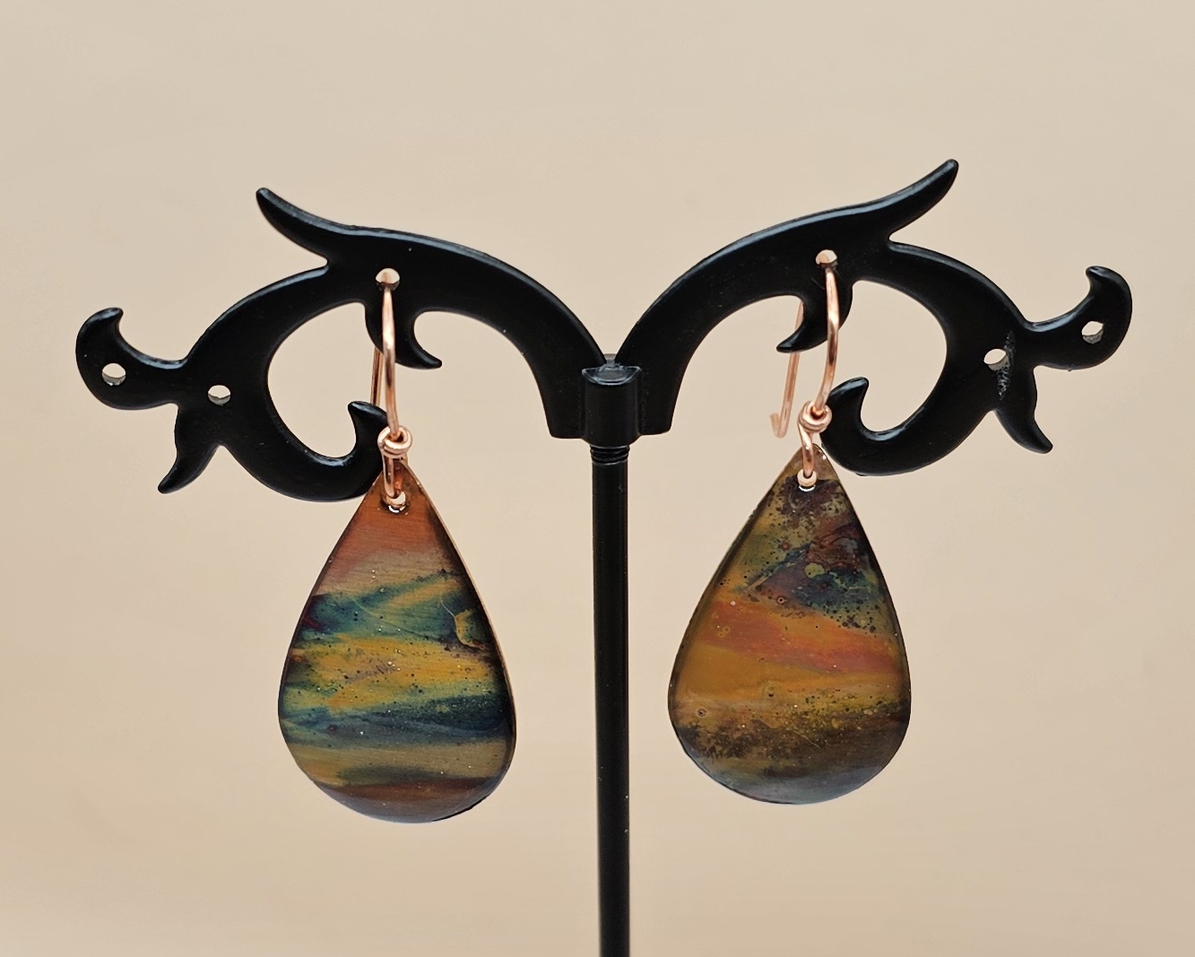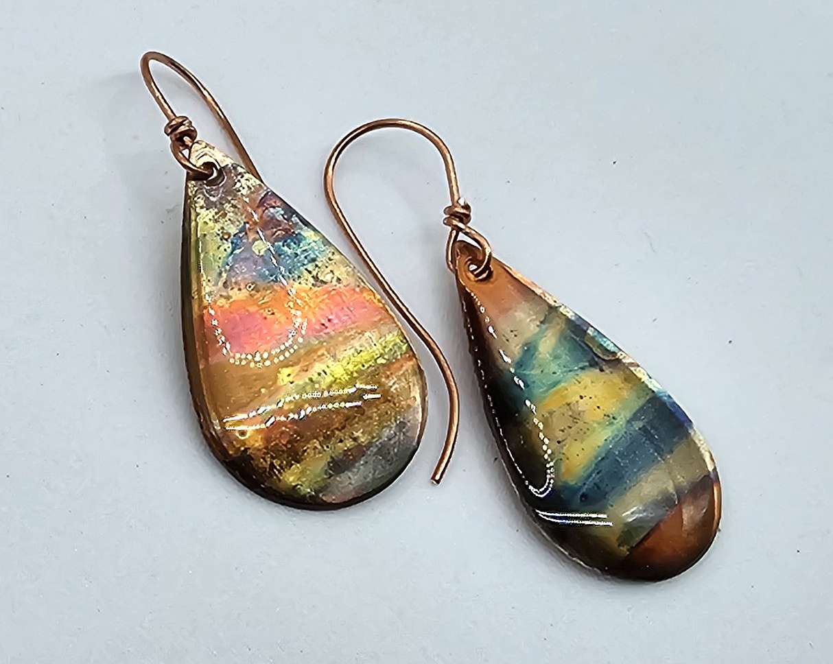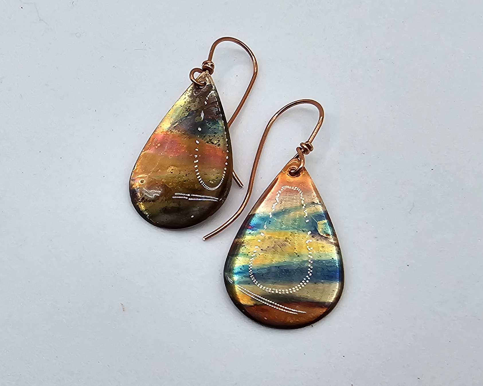 These are 24 gauge precut copper blanks, torch fired to bring out the beautiful colors, then sealed with UV resin. They are hung on 21 gauge handmade copper earring wire.
