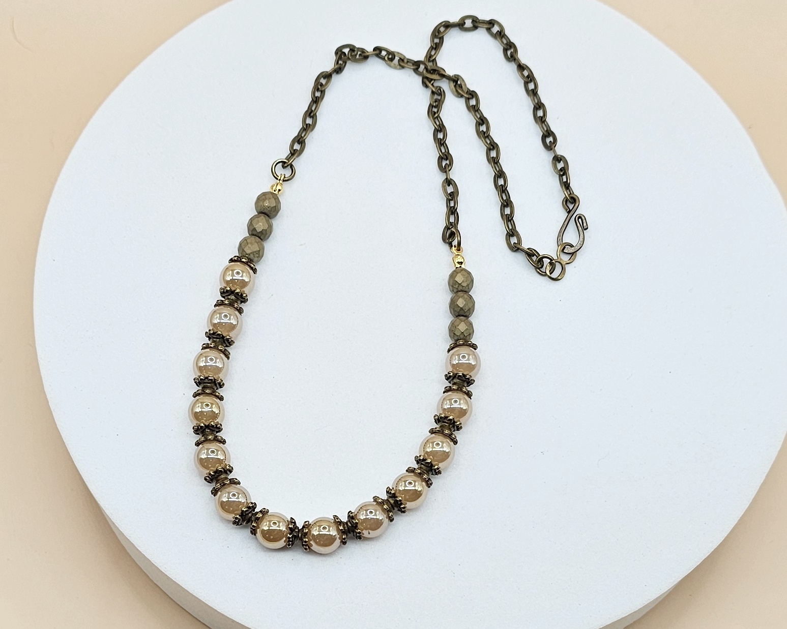 This vintage inspired handmade necklace features antiqued brass chain combined with a central strand of glazed agate beads, brass accents, and hematite. The peach tones add softness and warmth, while the textured hematite introduces subtle contrast and structure. Antiqued brass accents frame each bead, giving the necklace its vintage finish without feeling heavy or ornate.