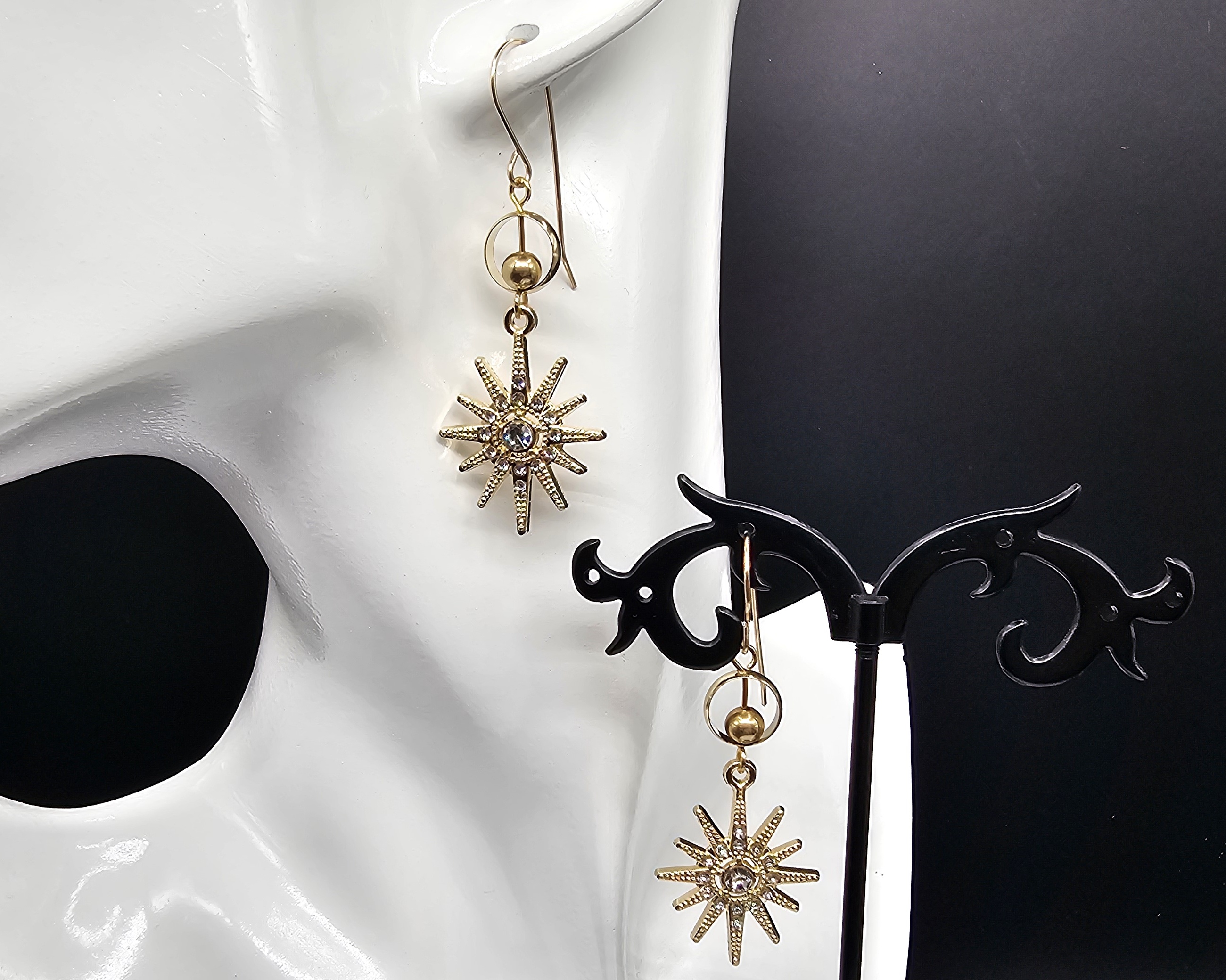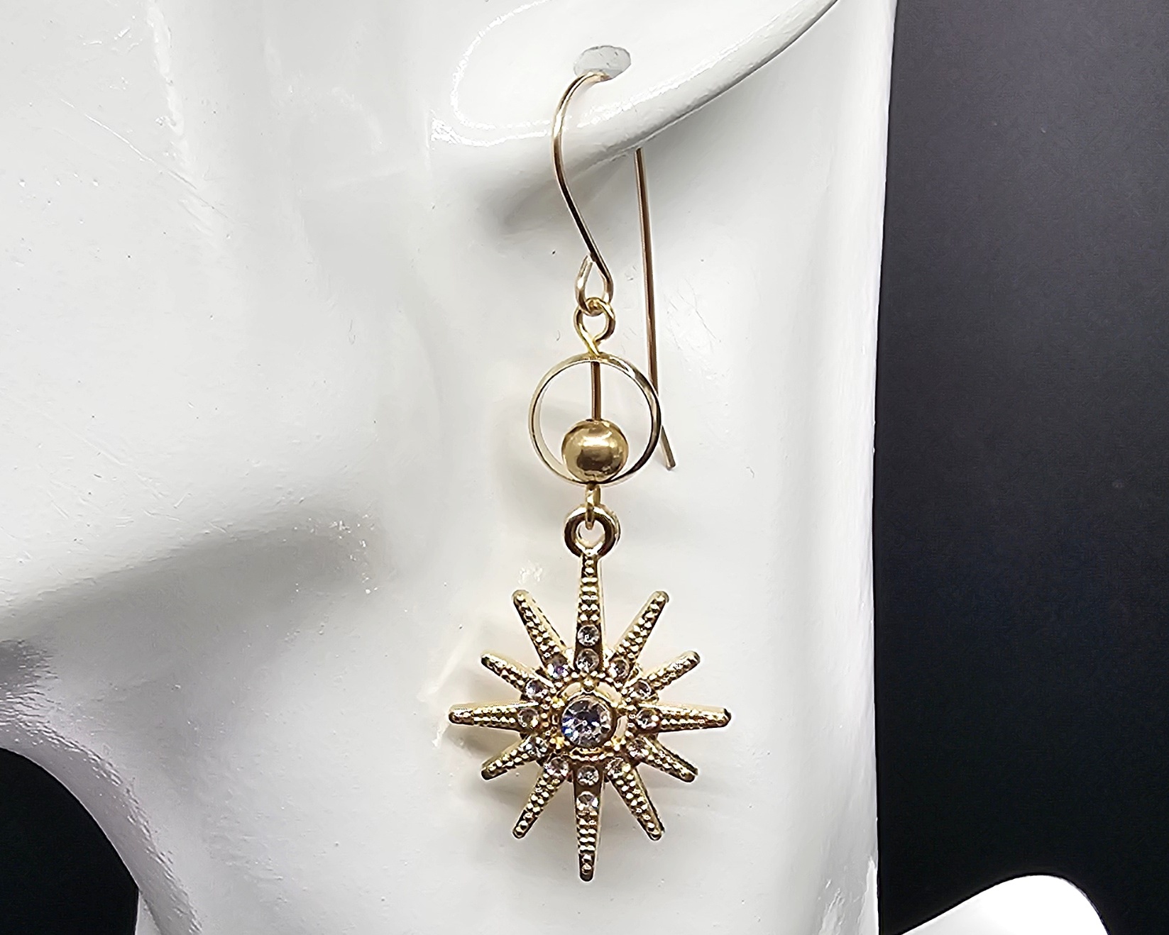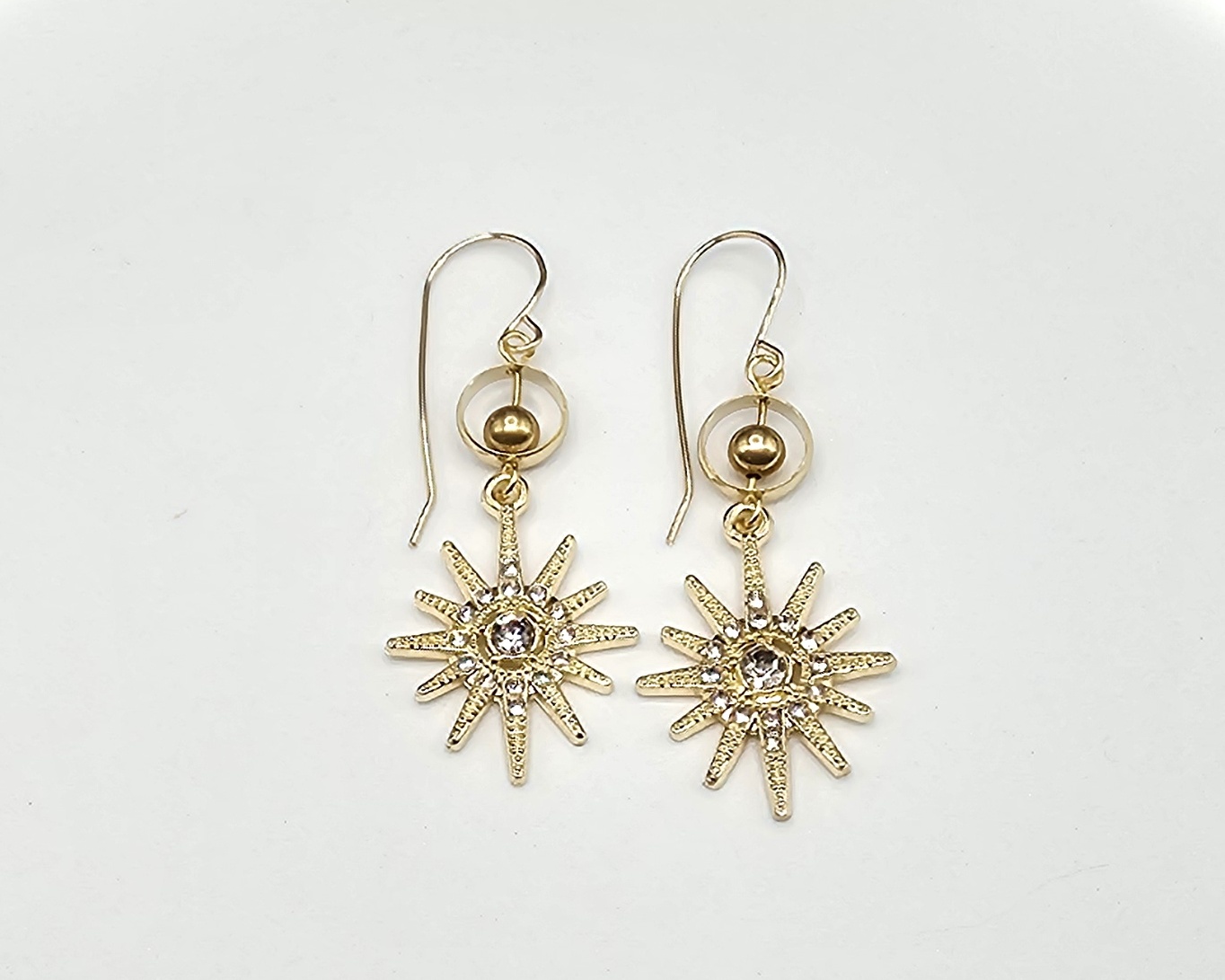 Illuminate your wardrobe with these handmade celestial starburst earrings,designed to bring a little lightness, sparkle, and fun to your day. At 2.5 inches long, they’re the perfect mix of statement and elegance—glam enough for a night out, yet easy enough to add a little magic to your everyday look. Each earring features a radiant gold-plated star accented with sparkling rhinestones, a stainless steel circle and bead, and handcrafted 14k gold-filled earring wires, each as unique as the stars in the sky.