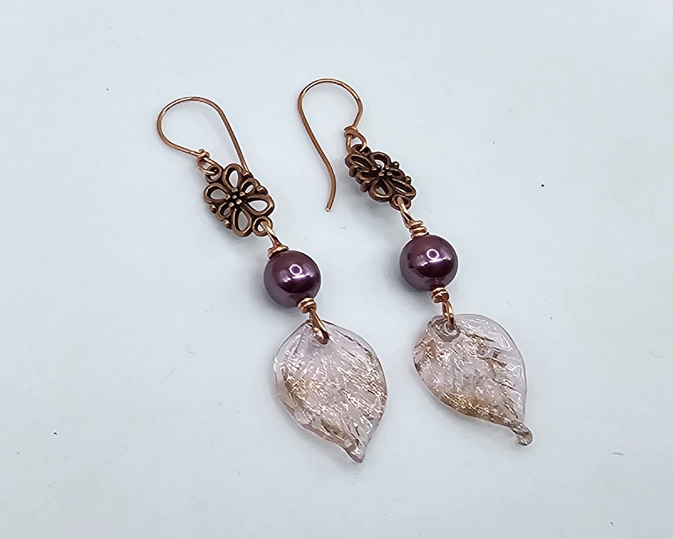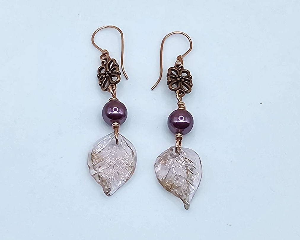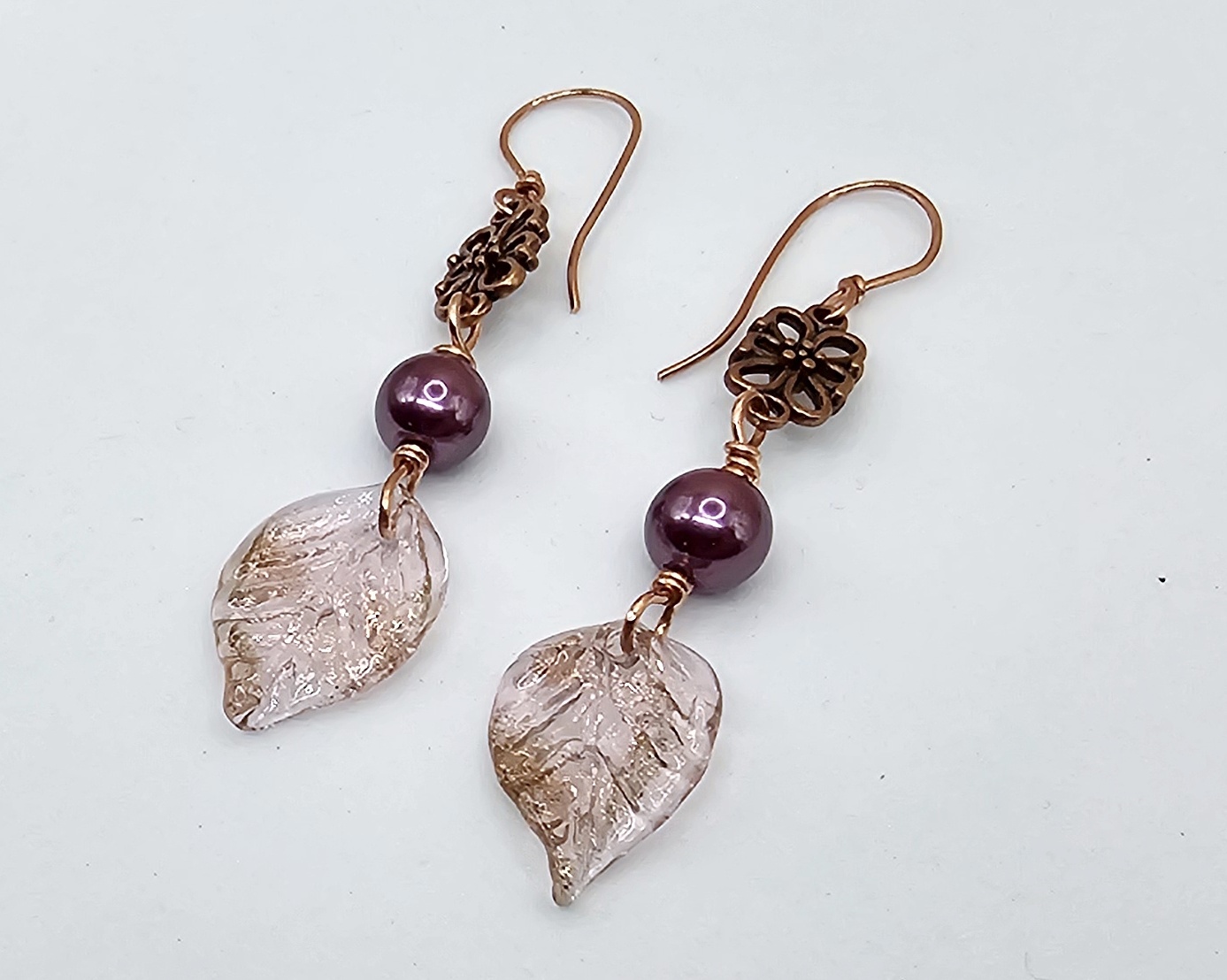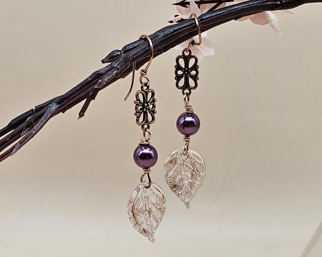Materials: Lampwork glass leaves, glass pearls, copper floral connectors